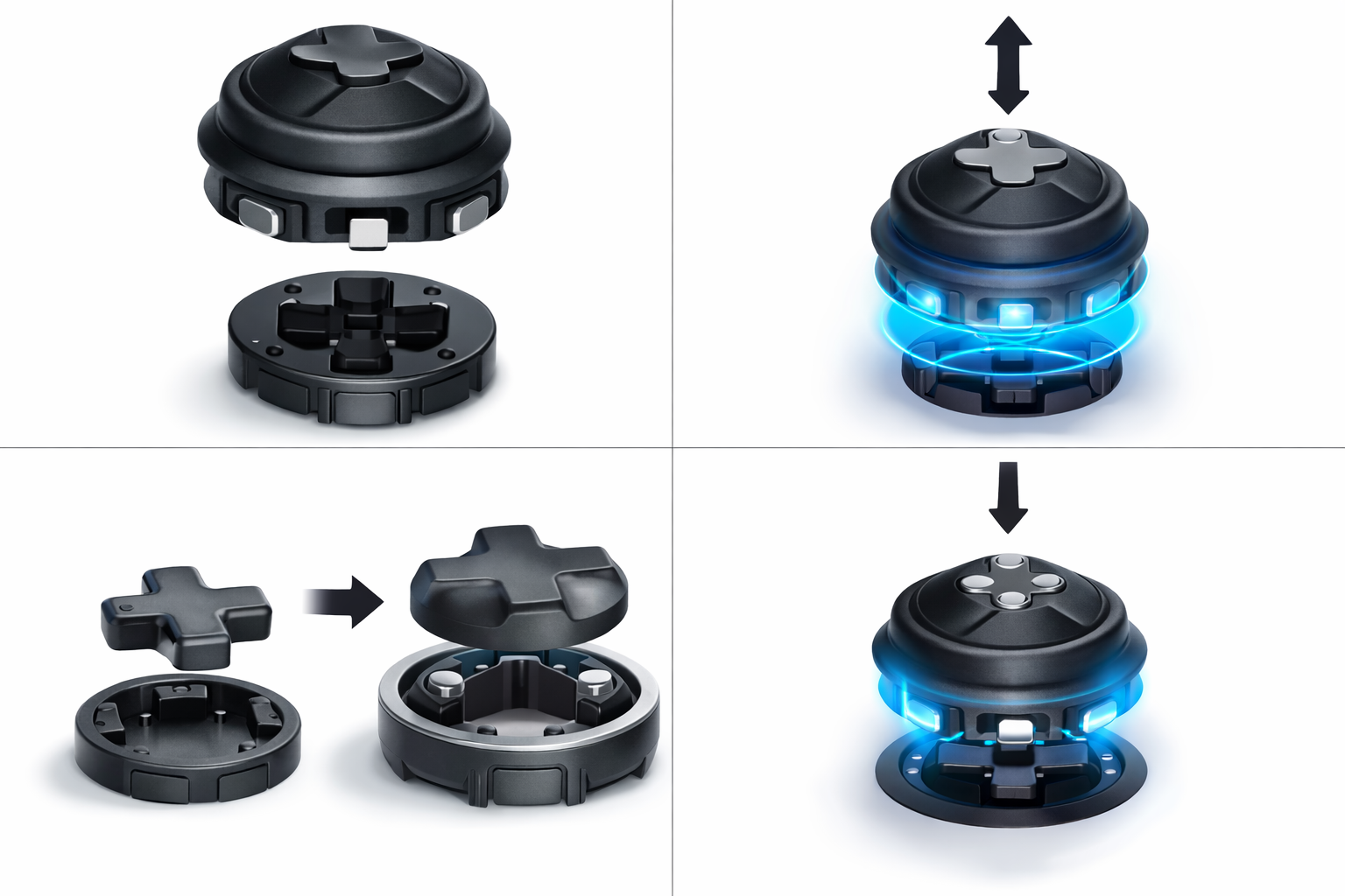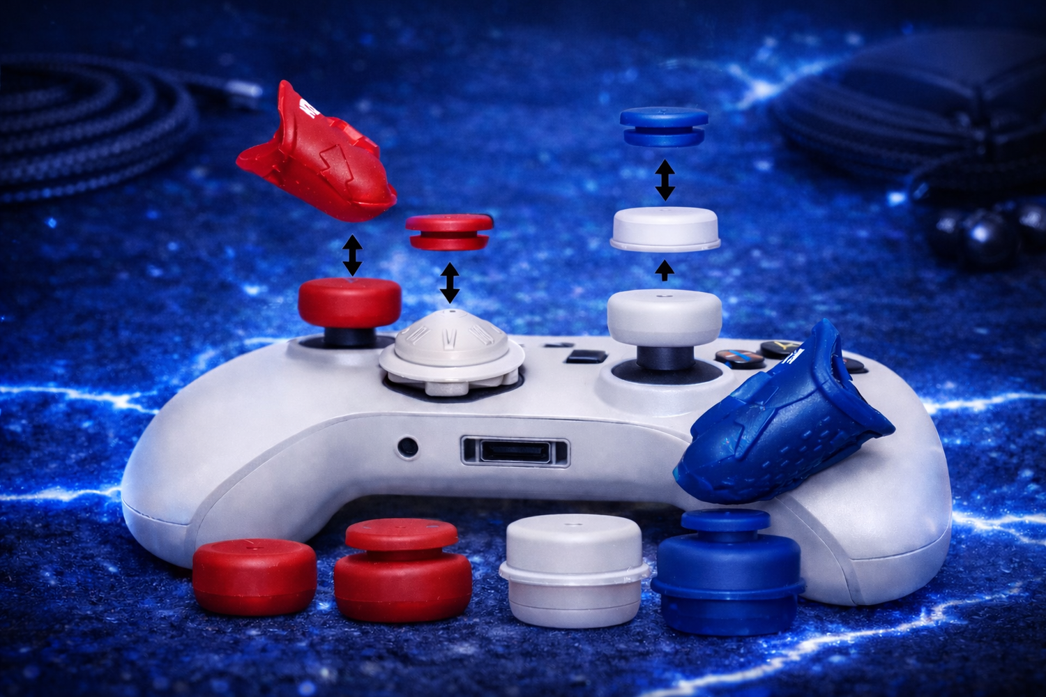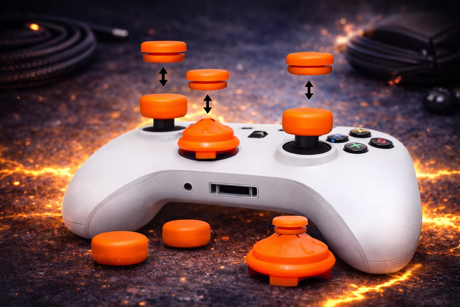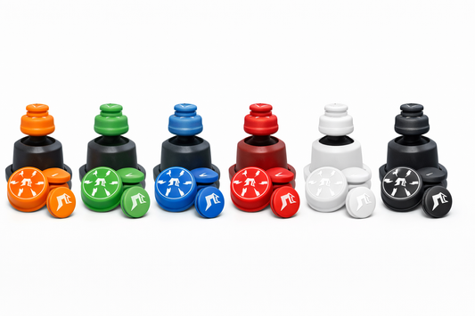 Magnetic, stackable thumb grips for adjustable height, consistent control, and precision feel.